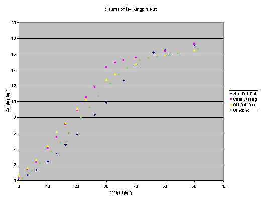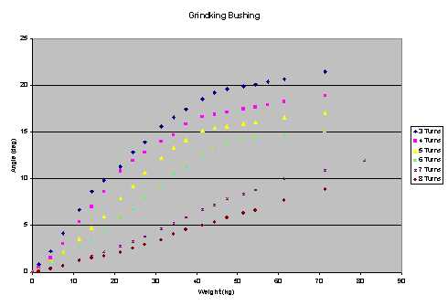The skateboard truck acts as a simple spring. For the first 30 to 40 kg of applied load, there is a linear relationship between the angle of deflection and the applied load. It can be surmised that the relationship follows Hooke�s Law. Force = k x The average user weighs 150 pounds or 68 kg. If this is divided between the two trucks, then the average mass of a user standing on the skateboard is 34 kg per truck. This means that in the majority of cases, the operating range of the truck falls in the first linear region. After 40 kilograms, the relationship becomes less linear. It requires more force to achieve the same deflection of the axle. This is in agreement with a simple mass-spring system. The axle can only deflect up until a maximum point. As it approaches this point, it becomes more difficult to deflect. As the kingpin nut is tightened, it becomes harder to deflect the axle of the truck. For example, when the Grindking bushing is tightened to only three turns, a 70-kg weight will produce an angle of deflection of 21.5 degrees. When it is tightened to eight turns the same 70-kg weight produces a deflection of only 8.8 degrees. This is the difference between a turn of radius 0.58 meters and a turn of radius 1.4 meters. When different bushings are used in the truck, the results vary. The clear bushing, which is the softest, generally gave the most deflection. However, at times it was comparable to the old, worked-in Shorty�s Doh Doh bushing. The Grindking bushing, which is the hardest, generally gave an average deflection when compared to the other bushings. The bushing that gave the least deflection, in most cases, was the new Shorty�s Doh Doh bushing. The difference characteristics of these bushings were noted. At 30 kg and 5 turns, the clear bushing produced a deflection of 14.2 degrees; the old Doh Doh, 12.7 degrees; the Grindking, 12.1 and the new Doh Doh, 9.8 degrees. This is a difference of 4.4 degrees between the bushing with the most deflection and the bushing with the least. During the test it was observed that for large deflections of the axle, there was metal on metal contact between the hanger and the baseplate. This reduced the effectiveness of the bushing. In addition, in some cases, the bushing would come out of the plate that was holding it. Since both of these events would occur during regular use of the skateboard, the results were left the way they were recorded and not adjusted in any way. |